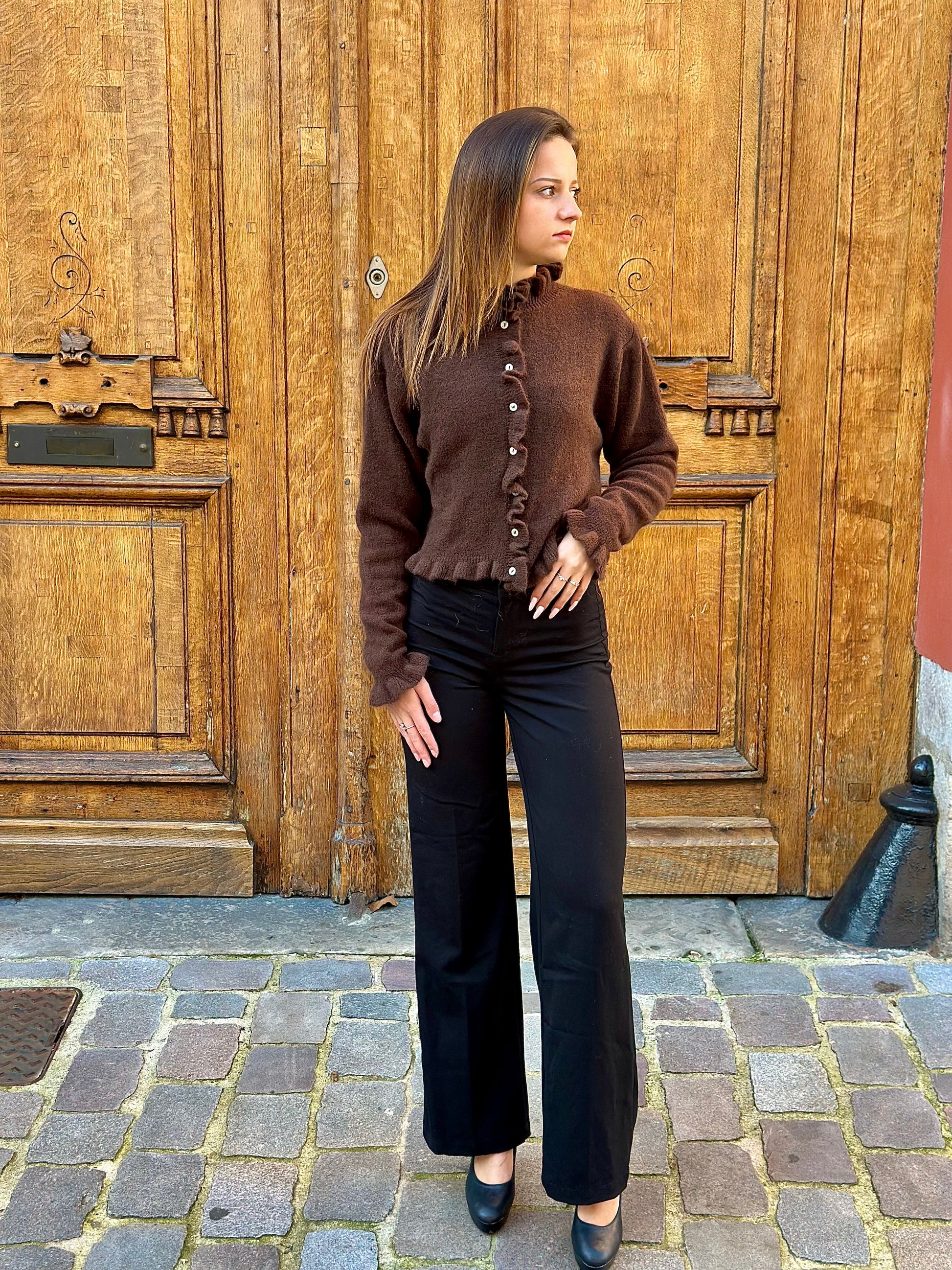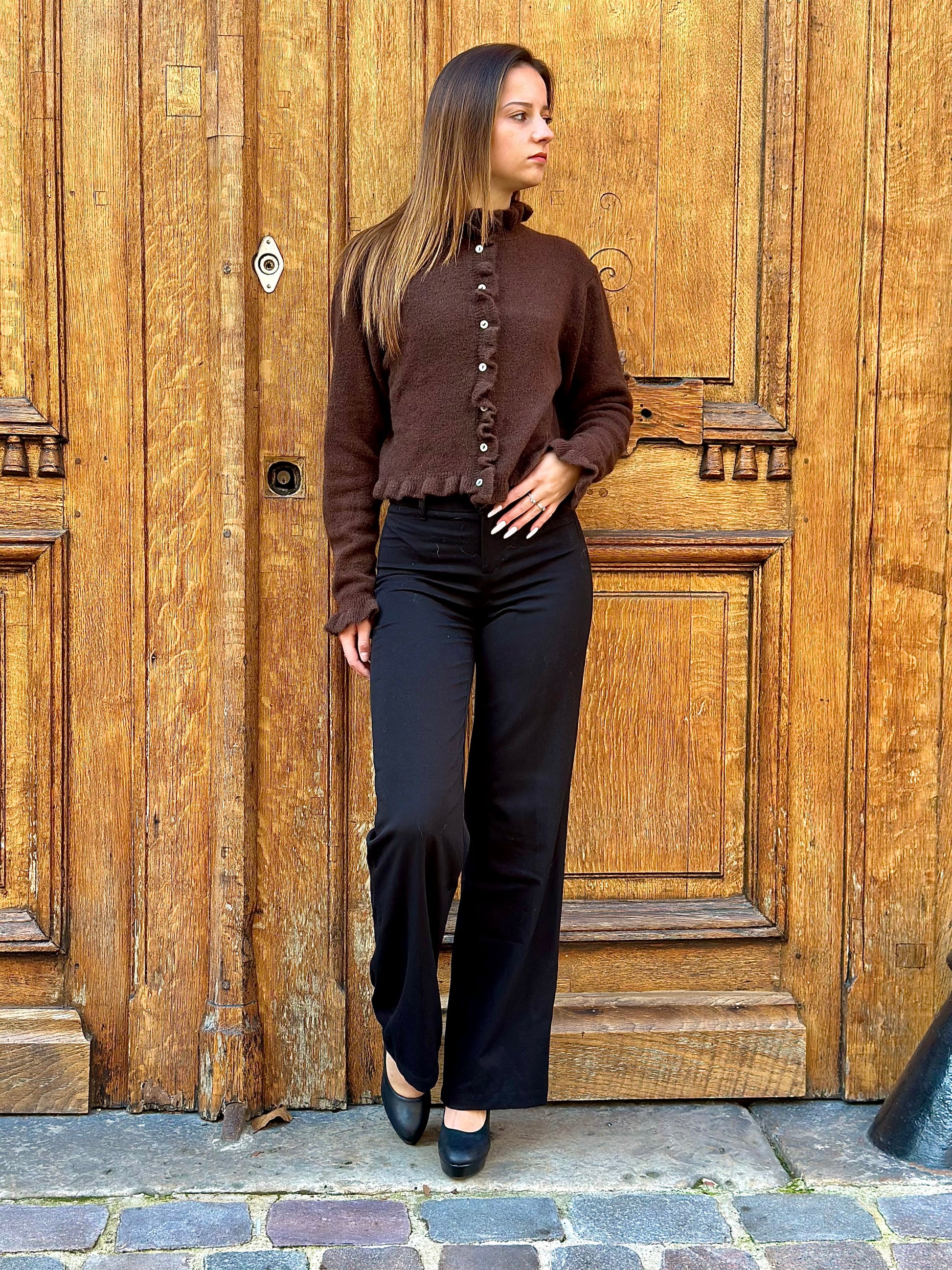 Cardigan marron avec col, poignets et bas de manches volantés, matière chaude avec 30% d'Alpaga parfait pour les soirées d'hiver, facile à associer avec un pantalon habillé, une jupe ou un jean