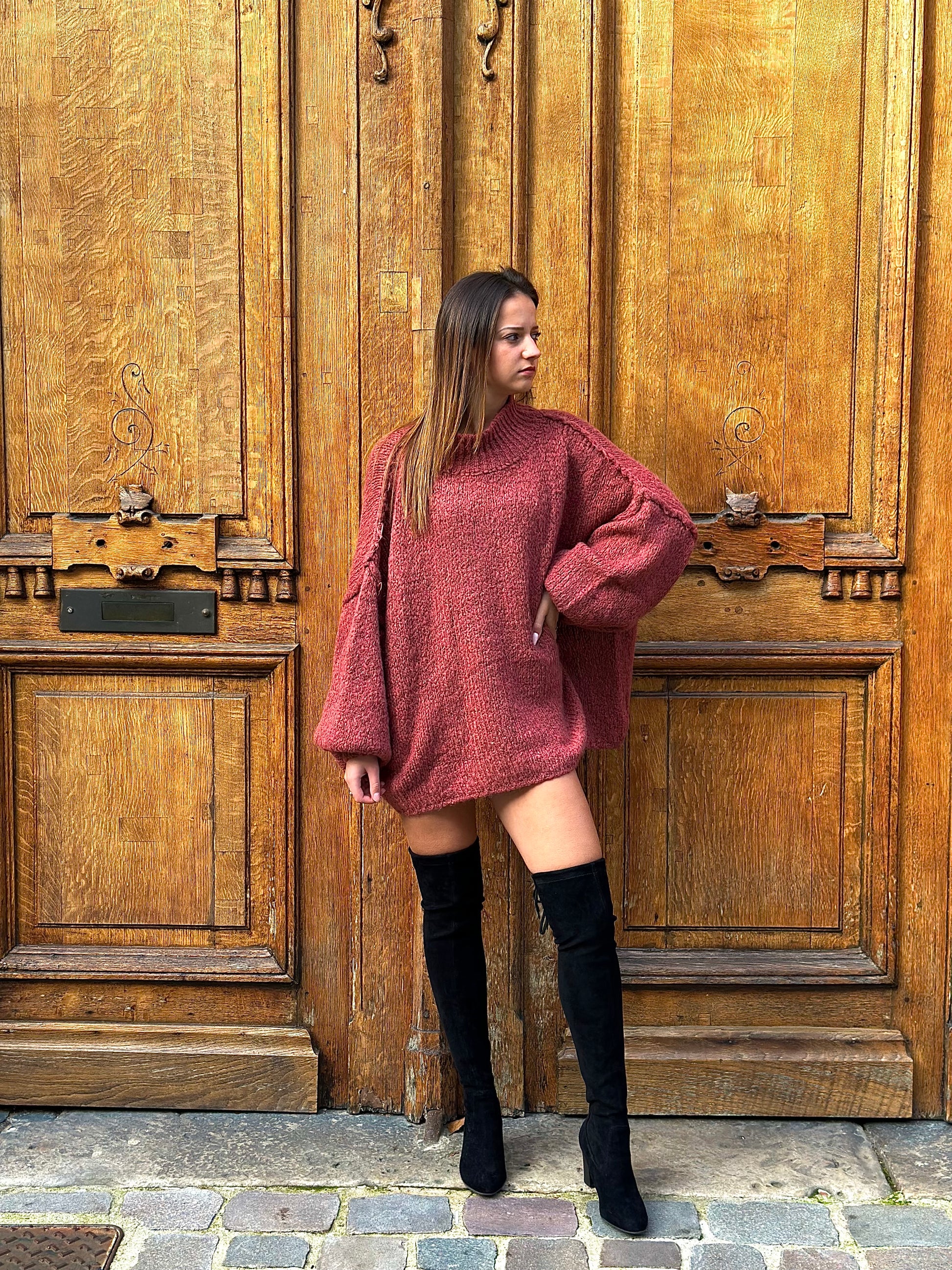 Pull oversize couleur rouille en laine et mohair en col rond avec finitions côtelées