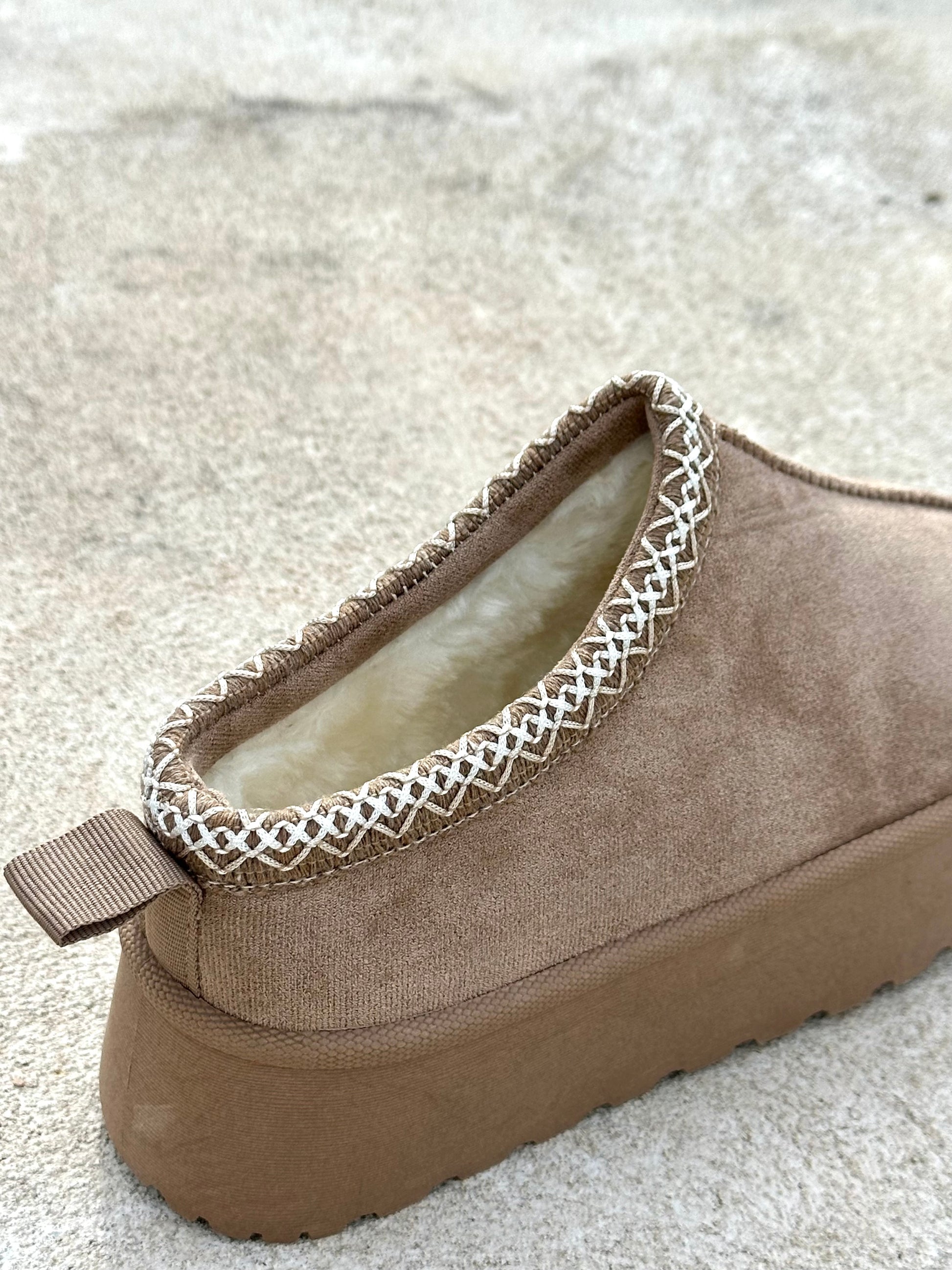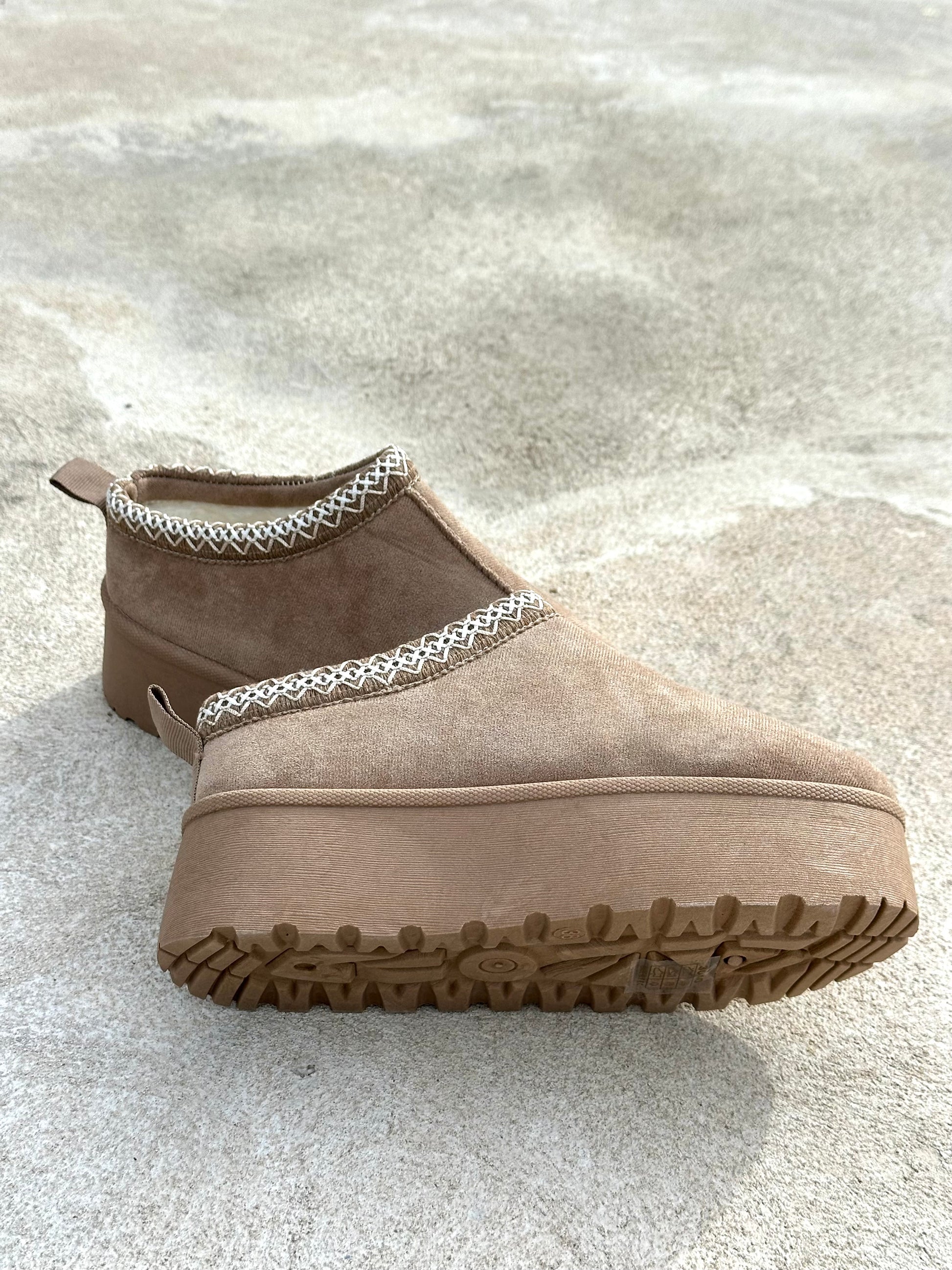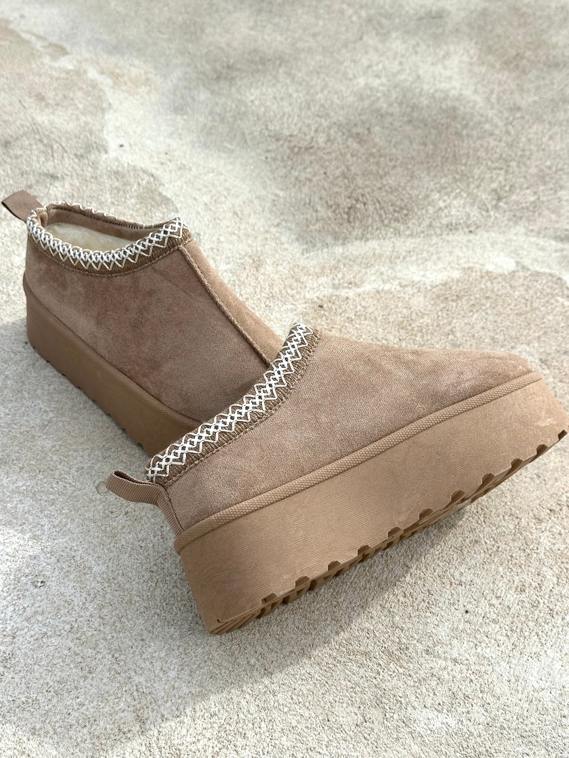 Bottine fourrée compensée en suédine avec bordure brodée, couleur taupe
